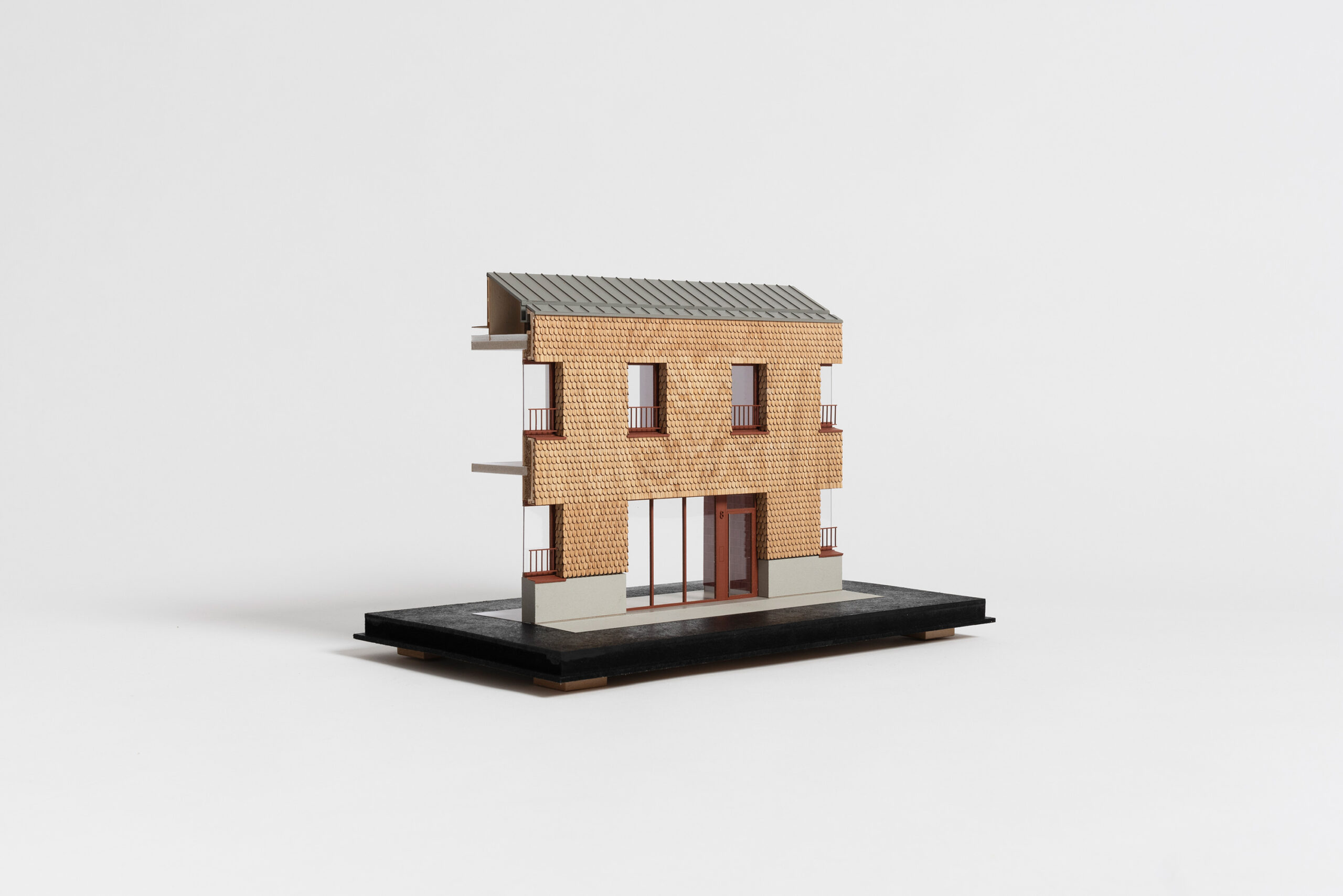 Situé au Sud du quartier, B117-E87 prend pour matrice une ancienne trace ferroviaire de près de 147 mètres de long. Le long bâtiment mono-pente qui en résulte (d’une épaisseur de l’ordre de 15 mètres) s’étire d’Est en Ouest. Il est destiné à 65 habitations locatives sociales, or pour habiter au mieux cette forme donnée, le projet développe une succession de grandes maisons directement inspirées par le tissu d’échoppes. On habite ici dans une douzaine de petits voisinages qui génèrent autant d’entrées sur la rue.