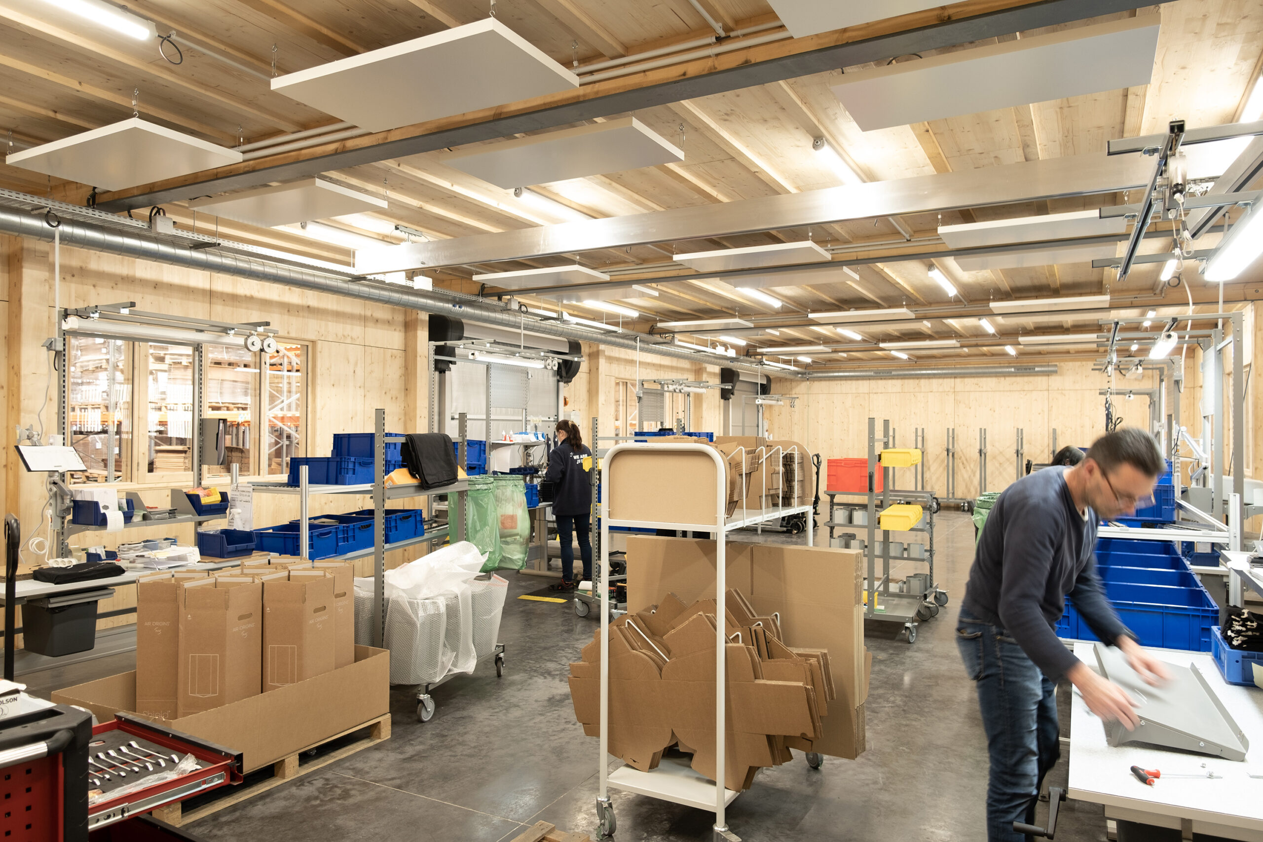 A partir d’une architecture de béton plutôt banale, les nouvelles fonctions s’expriment dans un code commun : le bois. Sur un dallage continu, showroom, salles de convivialité, bureaux, ateliers de recherche s’agencent avec fluidité. Transformées en fenêtres, les larges baies initialement destinées au passage des camions apportent une très grande clarté aux espaces.