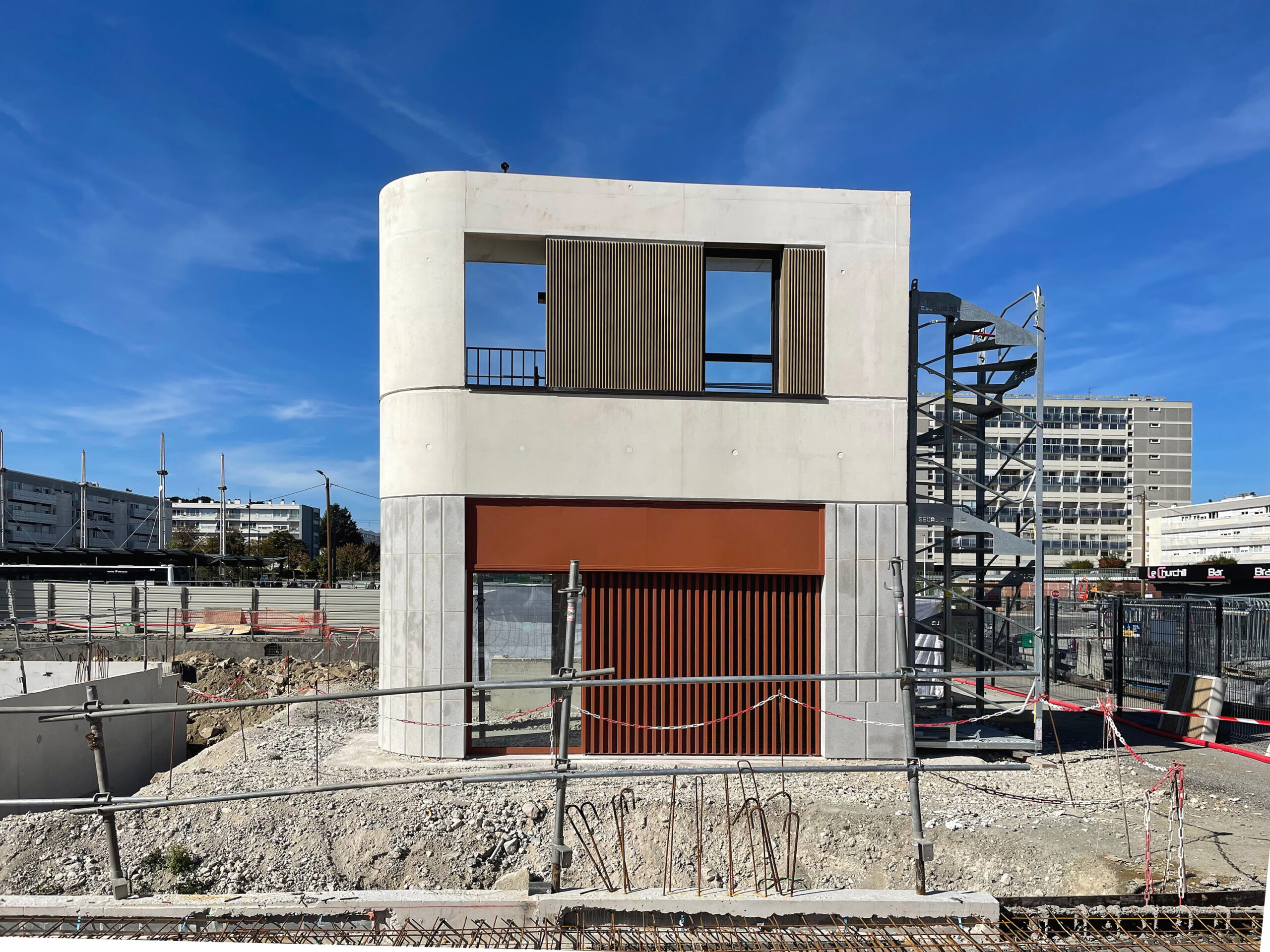 En rupture avec les angulations franches du quartier, la proposition décrit des angles adoucis. Dans ce contexte urbain réputé difficile, le projet « arrondit » donc littéralement les angles. Cette douceur s’exprime pleinement au sol, mais aussi dans le jeu de gradins des étages. Par ailleurs, Nova conjugue faible impact carbone et solidité d’un ensemble qui doit s’inscrire sur le temps long (une pérennité exemplaire au contact de l’espace public) : on trouve donc au cœur un bâtiment réalisé en bois, aux lignes plus domestiques.